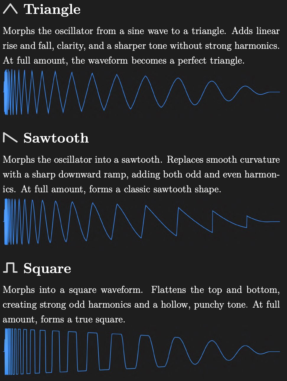 - Morphable Oscillator & Waveshaper – start from a pure sine wave and sculpt it with morphing, wavefolding, saturation, and distortion.
